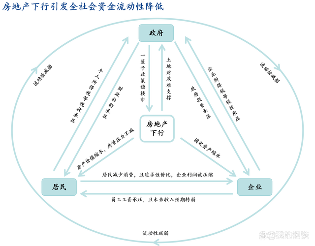 據(jù)前文所述,需求疲軟是物價(jià)低迷的表觀原因,深究則可能是消費(fèi)者的資產(chǎn)負(fù)債情況惡化以及收入預(yù)期轉(zhuǎn)差:地產(chǎn)行業(yè)進(jìn)入下行周期,房價(jià)的持續(xù)下跌一方面導(dǎo)致居民和企業(yè)的資產(chǎn)負(fù)債表惡化,縮減支出;另一方面也使財(cái)政收入承壓,疊加前期擴(kuò)表的債務(wù)清償壓力,共同導(dǎo)致社會流動資金縮水。