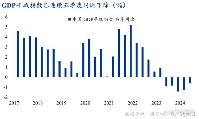 國內(nèi)生產(chǎn)總值平減指數(shù)可以反映整體經(jīng)濟(jì)價(jià)格水平,該指標(biāo)自2023年二季度起,至今年二季度已連續(xù)五個(gè)季度同比下降,市場擔(dān)心該指標(biāo)可能將下降延續(xù)至2025年,這將創(chuàng)下中國自1993年數(shù)據(jù)開始以來最長的通縮記錄。